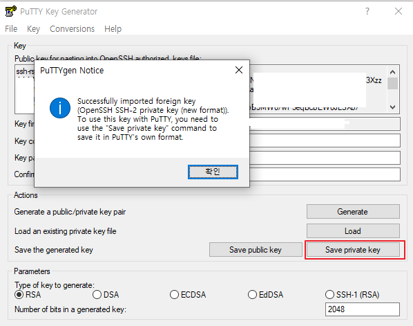 1. Putty Key Generator 에서 복사해온 개인키를 Load한다.