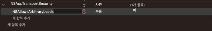 NSAppTransportSecurity , 사전 -> 새 항목추가 - > NSAllowsArbitraryLoads , 부울 , 예